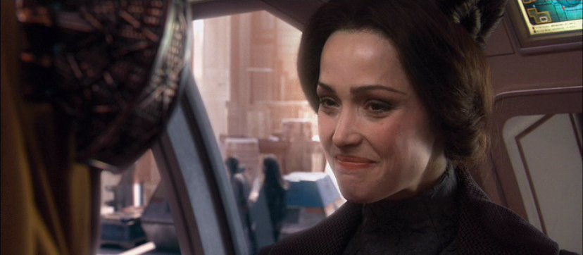 In this scene from Attack of the Clones, Senator Padmé Amidala is reluctantly leaving Coruscant for the safety of Naboo, on the insistance of Chancellor Palpatine. Anakin Skywalker has been assigned to accompany and protect her. The two of them are dressed to look like refugees and are flying incognito, while Dormé and Captain Typho remain behind to keep up the appearance of Amidala's presence as long as they can. As the group parts ways, goodbyes are exchanged. Anakin gets a short lecture and a stern warning from Obi-Wan, while Dormé and Padmé share a sisterly hug and the faithful handmaiden worries over the Senator. After a final farewell, Anakin and Padmé head for their transport.